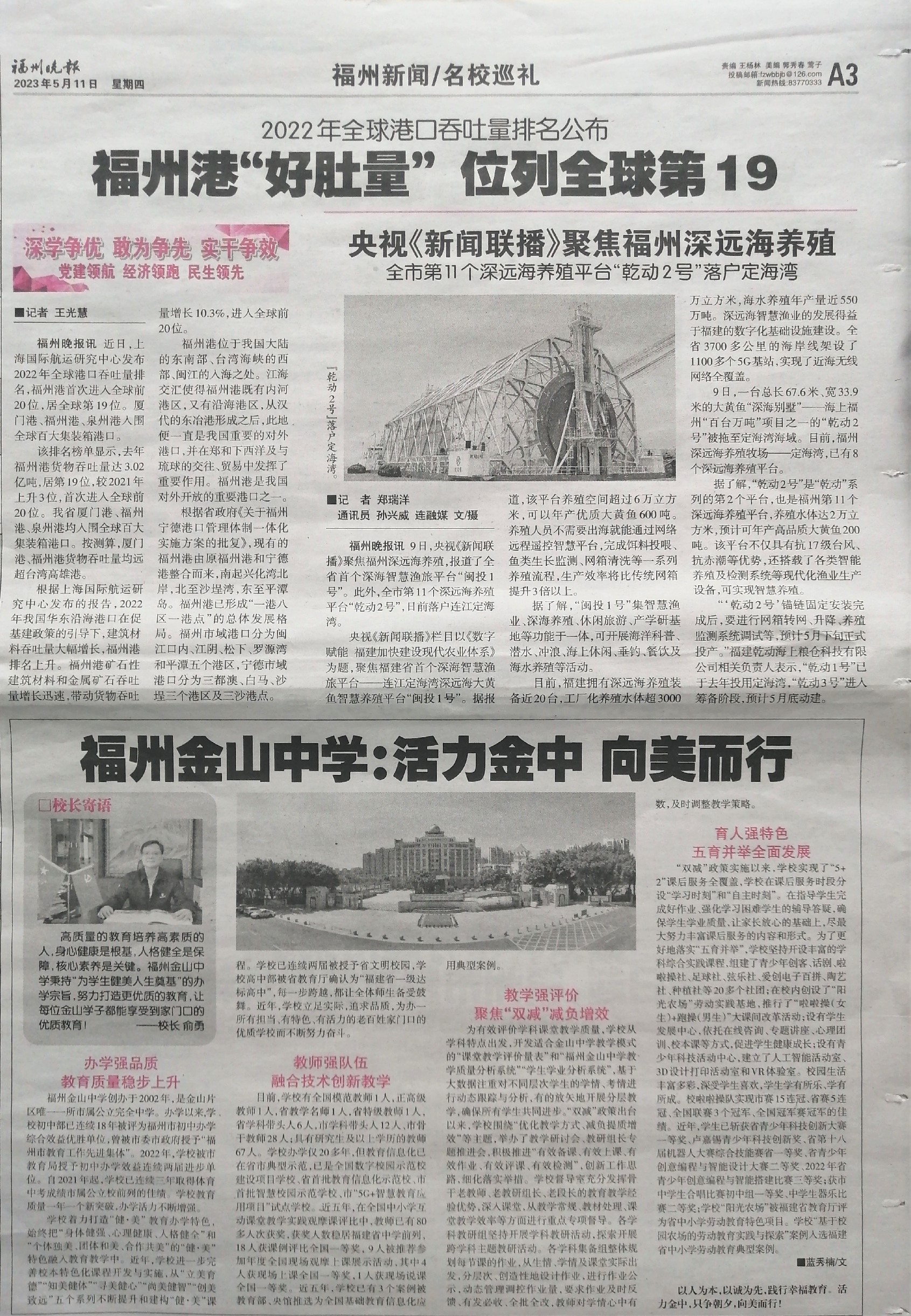 2023年5月11日,福州晚报宣传报道我校优质办学成果。
